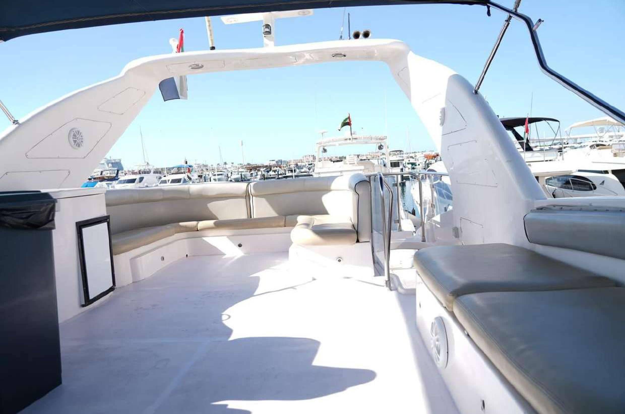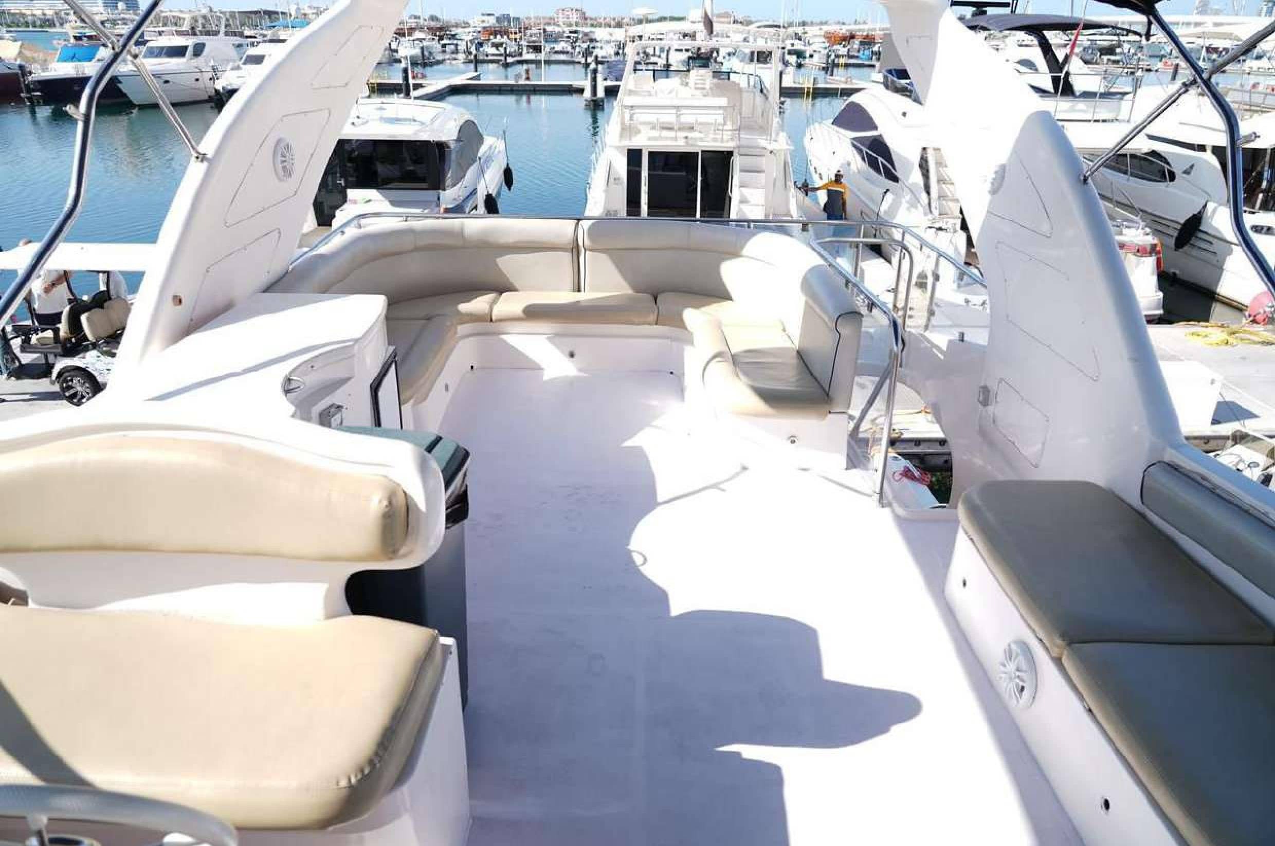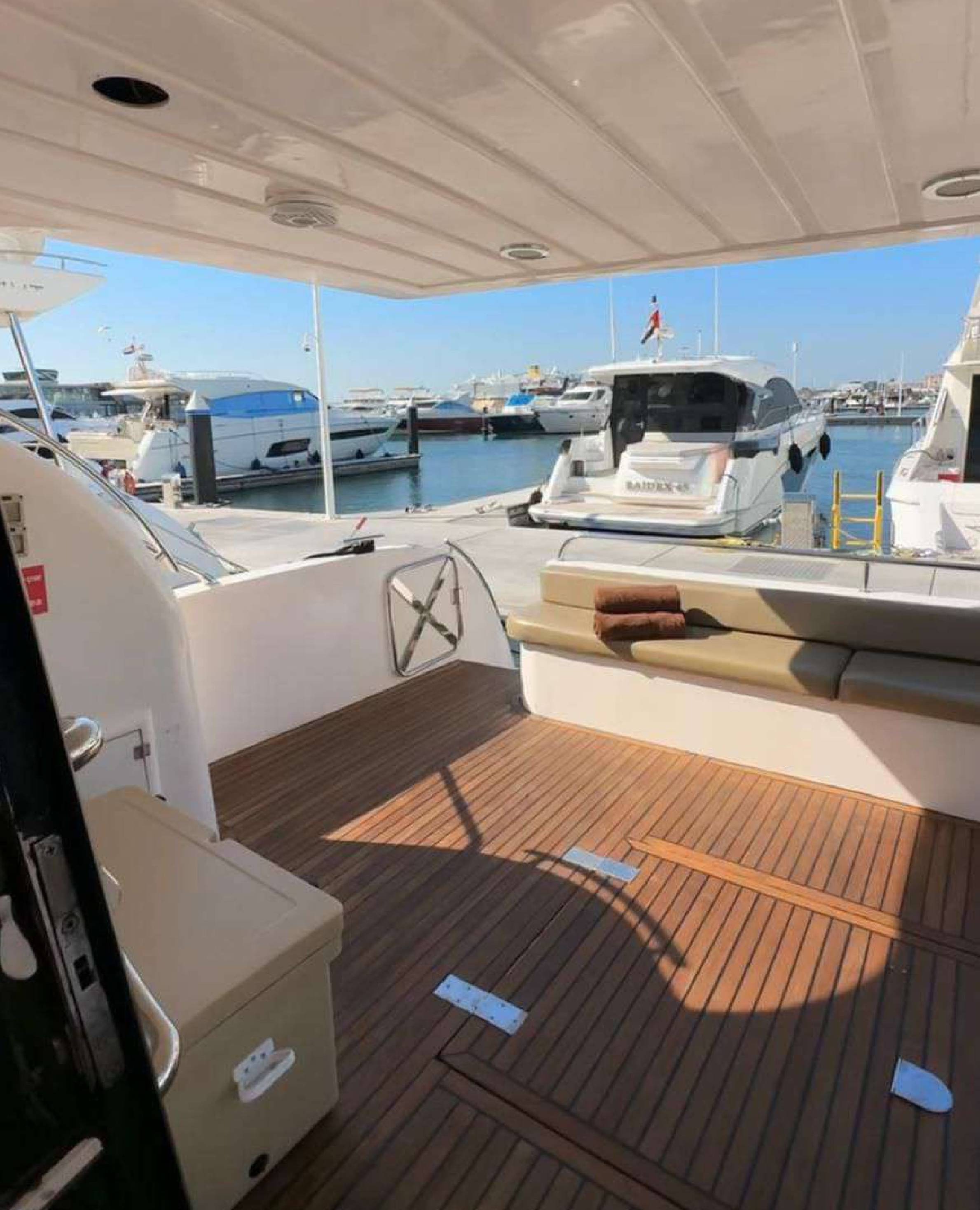 The flybridge is a true highlight, featuring a wet bar, lounge seating, and a Jacuzzi that offers the ultimate in relaxation while overlooking the endless horizon. Sunseekers will love the foredeck, which includes oversized sun pads and a private seating area for serene moments.