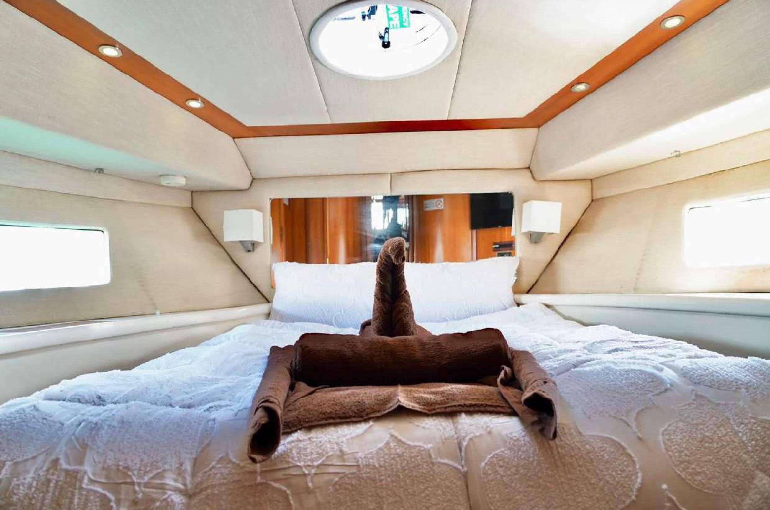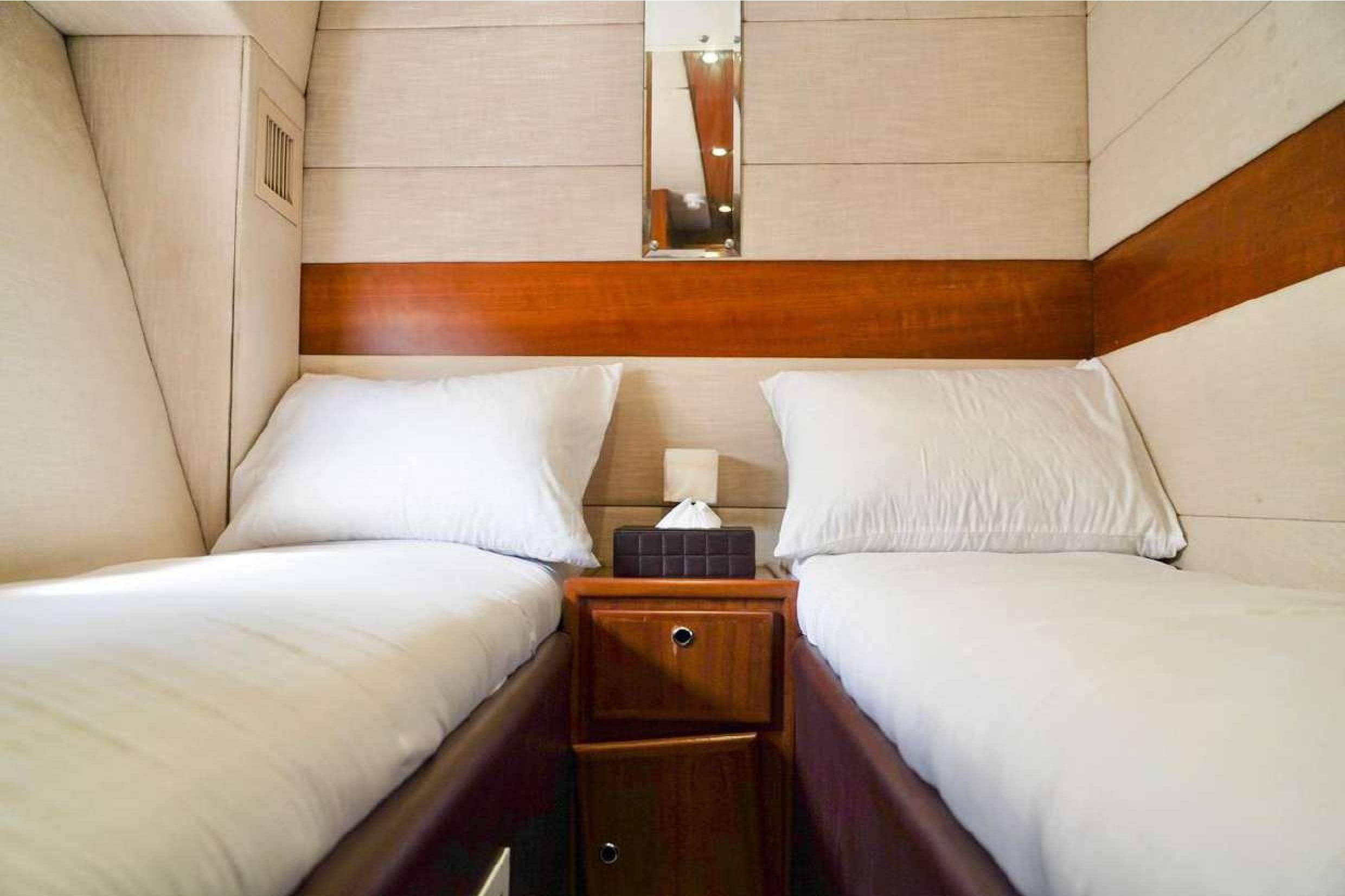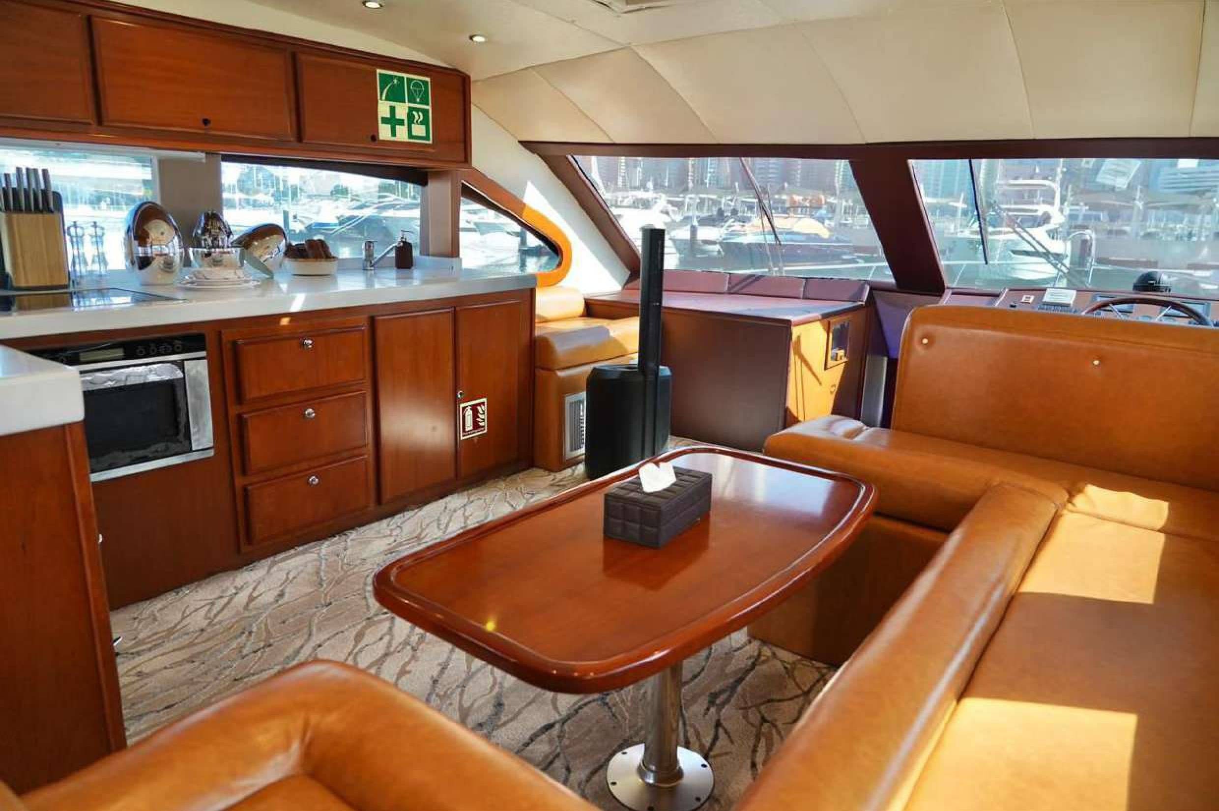 The flybridge is a true highlight, featuring a wet bar, lounge seating, and a Jacuzzi that offers the ultimate in relaxation while overlooking the endless horizon. Sunseekers will love the foredeck, which includes oversized sun pads and a private seating area for serene moments.