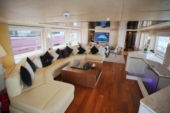 The main salon is a stunning display of modern design, featuring plush furnishings, a panoramic ocean view, and an advanced entertainment system. Adjacent to the salon is a formal dining area, perfect for hosting exquisite dinners prepared by the onboard chef, with every meal an experience tailored to your tastes.